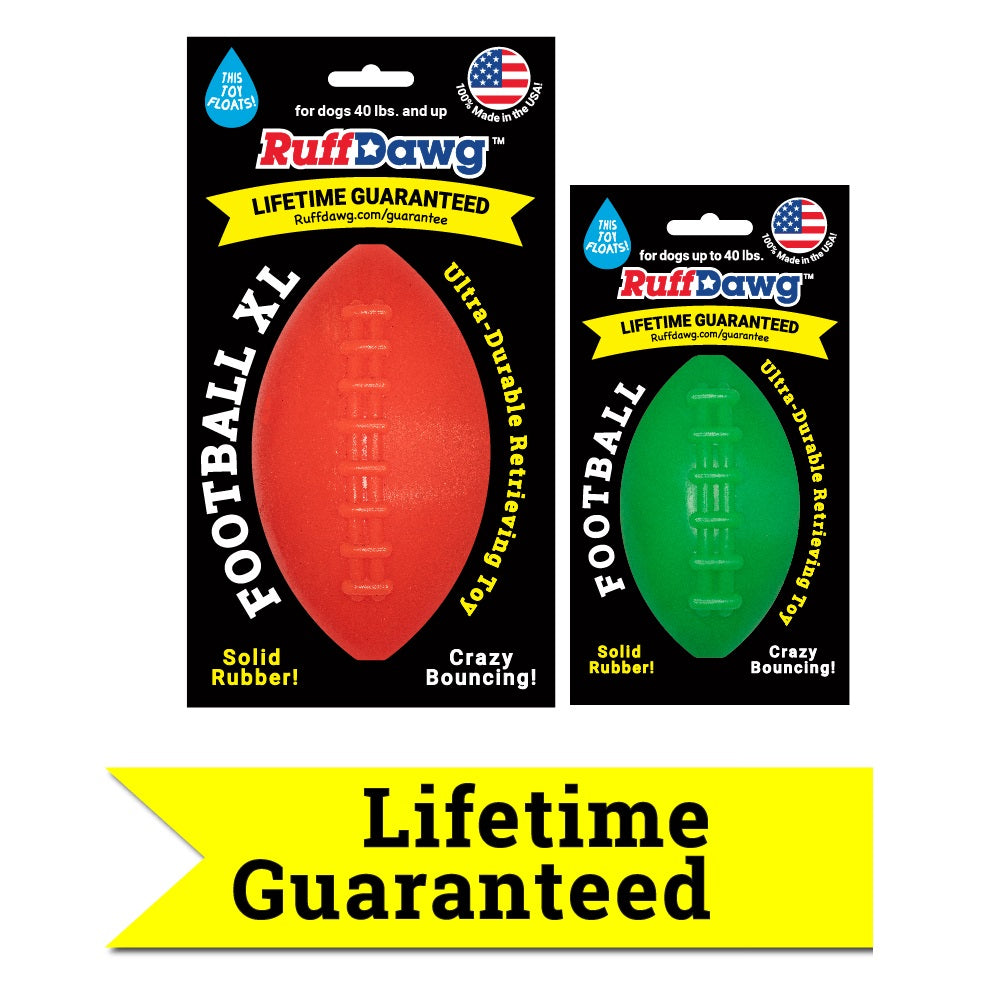 Ultra-durable, solid rubber retrieving toy with a Lifetime Guarantee directly from Ruff Dawg. Our toys are 100% Made-in-the-USA, and our premium rubber is FDA-approved, free of phthalates, latex and BPAs – for safe play!