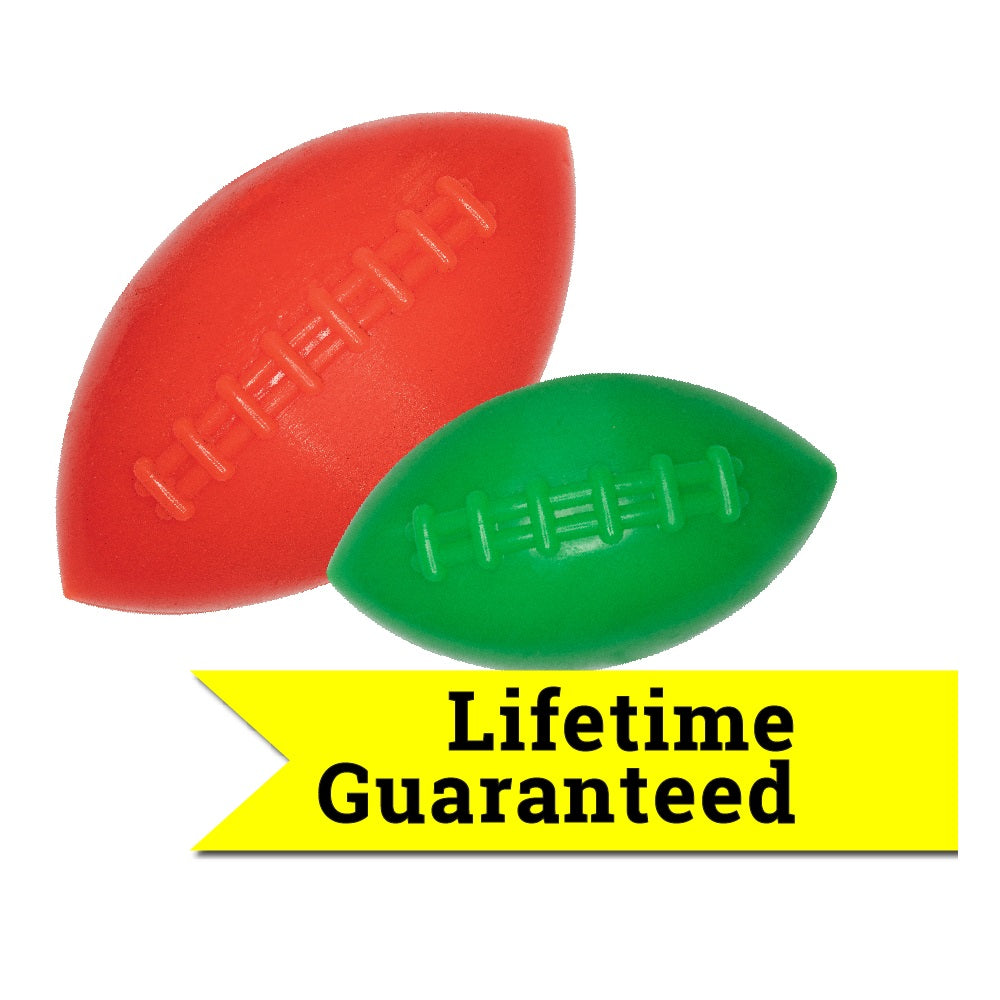 Dogs asked and we answered…these football shaped toys are designed for dogs who love rugged play! They float for water retrieving and are fun to throw – with a crazy bounce, so retrieving play on land is extra-exciting. They take serious abuse during heavy play, with a springy bite texture dogs love – that’s also gentle on teeth and gums!